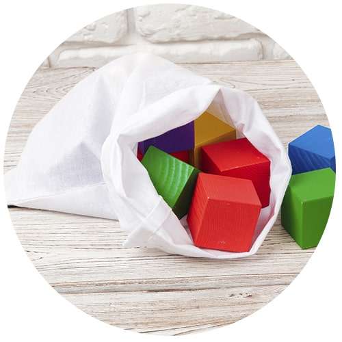 - Bolsa misteriosa, bolsa de tela bonita donde se introducen pequeños objetos para sorprender al niño.